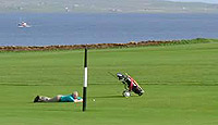 Strolling down the fourth fairway Olly and his playing partners were discussing the likely outcome of the upcoming Afghanistan elections, how CO2 emissions were making crops less nutritious and does Magners count towards your 5-a-day. Keith meanwhile trudged dutifully a few steps behind his master. Next door on the third tee Thurso's Socket Rocket Ronnie O'Dunnett was allowing for his usual right angled assault on the par 3 by aiming well left. However this time the ball flew straight and true.. and fast... towards Olly! Olly's spidey sense however was alert to the danger and showing the kind of footwork that would be well suited to his favourite show 'Strictly Come Dancing' he gracefully, if not gallantly, swiveled round and hid behind Keith allowing him to take the full brunt of Mr O'Dunnett's shot. Not only did Keith receive a nice big red pitchmark to his torso but it even melted a patch on his windcheater! Keith just laughed. Unlike the R&A officials when he gets hold of them for creating that anti cack-handed Dounby rule.