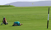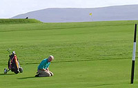 First up is brother of previous entry Gary 'Big Red' Johnston - Keith 'Big red mark' Johnston. Keith wasn't even playing this year due to R&A legislation preventing cack-handed Dounby players from entering 36 hole events (it's a controversial rule but I think a fair one). So Keith selflessly offered to caddy for our old friend in this page, Olly Sinclair. Having featured twice here already and knowing like I do that the day throws up far too many opportunities to feature again Olly was alert to any mishaps that might come his way. And sure enough after an event free first round he didn't have to wait long into the second...